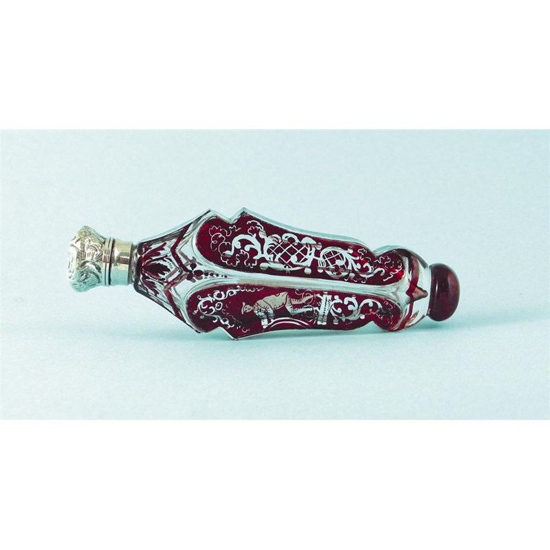 A Victorian mounted clear glass scent, with an embossed cover, the body flashed with red and etched with a figure and decorative motifs, unmarked, 4.45in, (11.2cm).