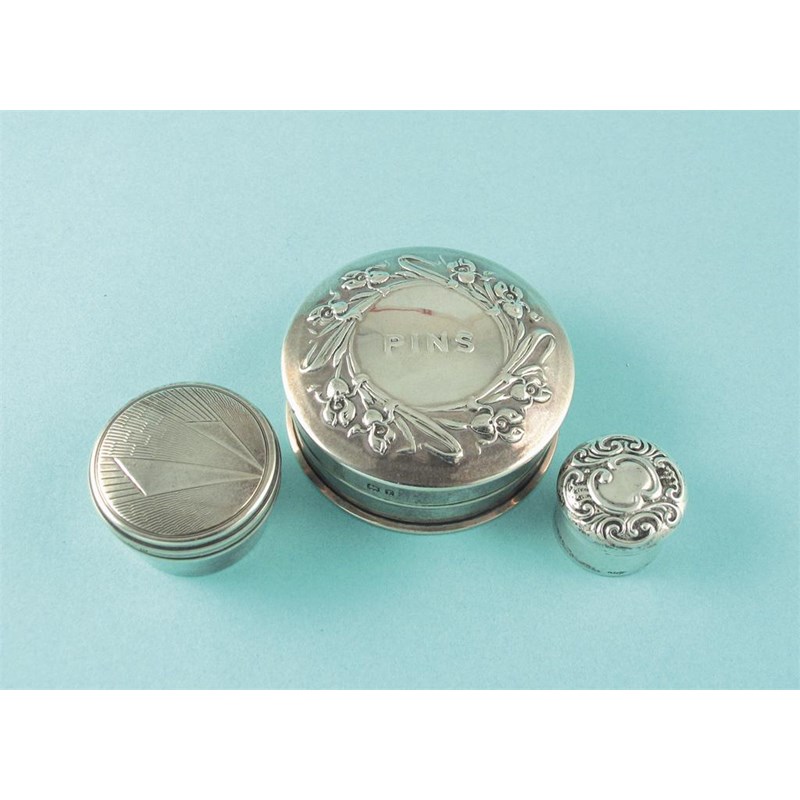 A modern circular pin box and cover, and two other small circular boxes with pull of covers, mixed makers and dates, the pin box 2.25in (6cm) diameter.