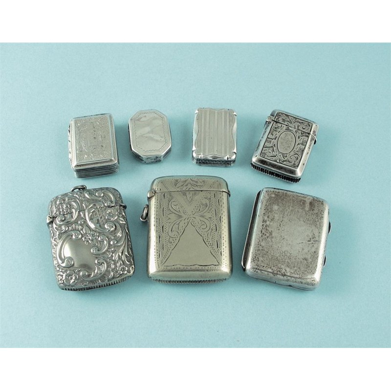 A mixed lot of seven boxes including: a George IV vinaigrette; a Victorian vinaigrette; a George III vinaigrette; a vesta case; a pill box and two plated vesta cases.