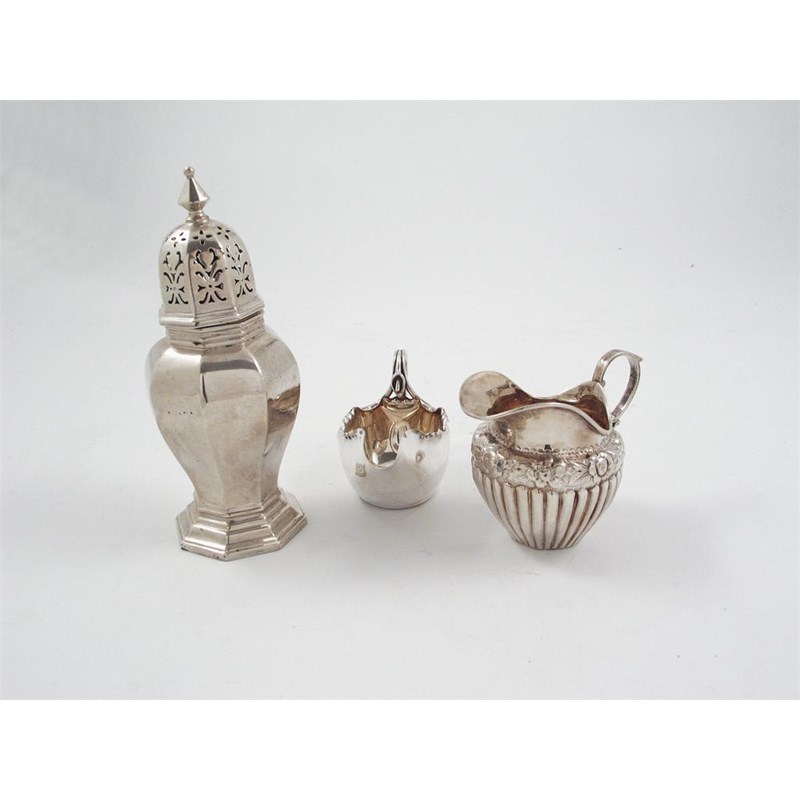 A modern octagonal sugar castor, and two small cream jugs, 6oz, (3).