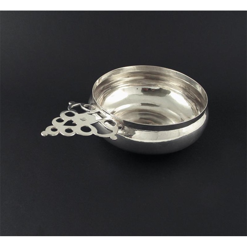 A James II bleeding bowl, of circular form with a shaped and pierced lug handle, stamped with the initial 'M', by an unascribed maker (IC, mullet below, see Jacksons Revised, pp. 137), London, 1686, 8in (20.3cm) wide overall, 7oz.