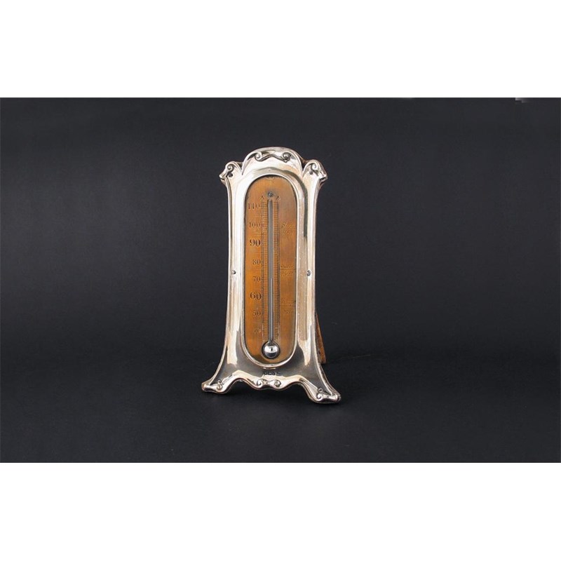 An Edwardian mounted brass thermometer, with a scroll border and an easel back, maker's mark TW and H, Sheffield, 1902, 6.25in (16cm).