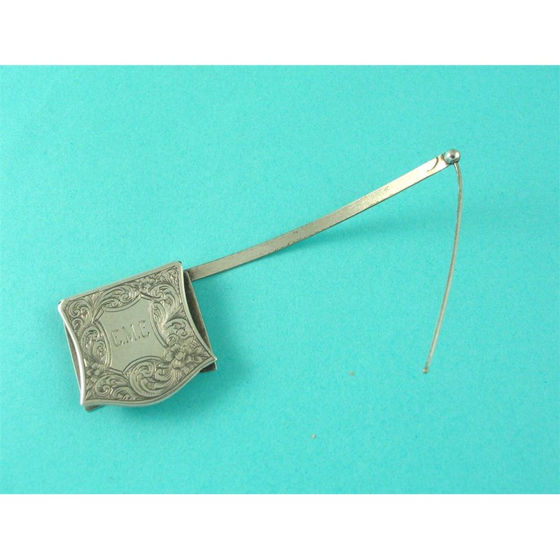A late Victorian 'cross patent' book mark, with an engraved panel, initialled 'CMC' by W. Cross, London 1897, 4in (10cm)long.