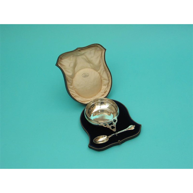 A George V bleeding bowl, with pierced lug handle and matching spoon, contained in a case with silk lining, by The Goldsmiths & Silversmiths Co, London, 1910.