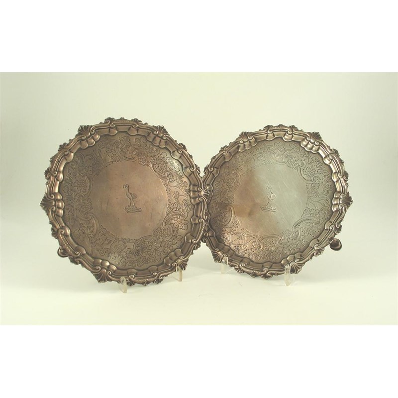 A pair of George II Irish salvers, with husk and scroll borders, a central crest, flanked by flat chased fruiting vines and birds, each engraved on the revers with a scratch weight '10-13-12' and '10-18-12', each salver struck with two makers/sponsors marks; I G for John Gumley and E M [twice] for Edward Murray, Dublin, circa 1750, 7.8in (20cm), 20.5oz, (2).
