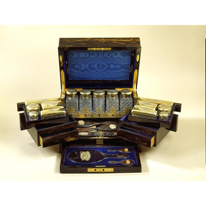 A Victorian large brass bound Maccassa ebony toilet box, with a lift up cover and a fall front revealing two sets of swing-out trays (the lower trays with concealed drawers), fitted with the following cut glass silvergilt mounted items: four toilet water bottles, a cylindrical jar, four small circular pots, two narrow oblong boxes, three other boxes and an oblong powder box with sprung cover; the interior with a tortoiseshell dressing table set comprising: two hair brushes, two clothes brushes, a pair of glove stretchers, a shoe horn, a hand mirror and two dental mirrors; the tortoiseshell items with a large applied gold cypher, the cover similarly applied with a silvergilt cypher and the mounts engraved with the same, the mounts by Messers Betjemann, Betjemann and Betjemann, London, 1881-1885, the fall front with an inset gilt metal plaque inscribed 'R and S Garrard & Co., 25 Haymarket, and 29 to 32 Panton Street', the box measuring 9.75in (24.6cm) x 14.5in (37cm) x 11.6in (29.5cm).