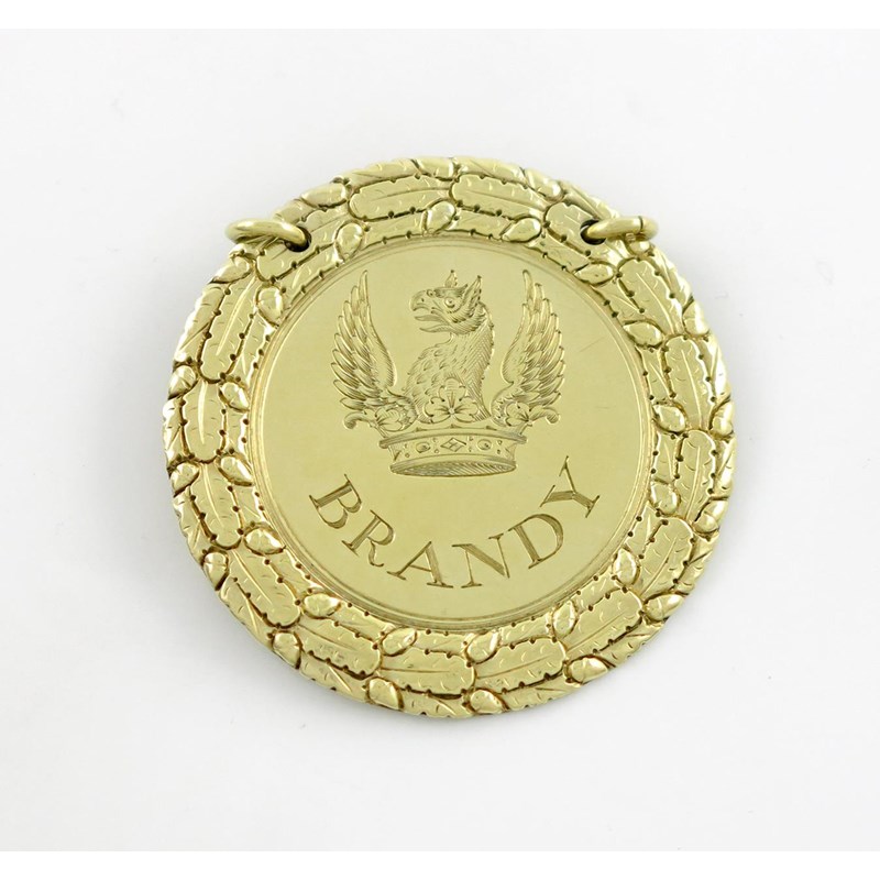 circular form, oak leaf border, engraved with a crest and incised 'BRANDY', diameter 5.3cm, approx. weight 0.9oz.