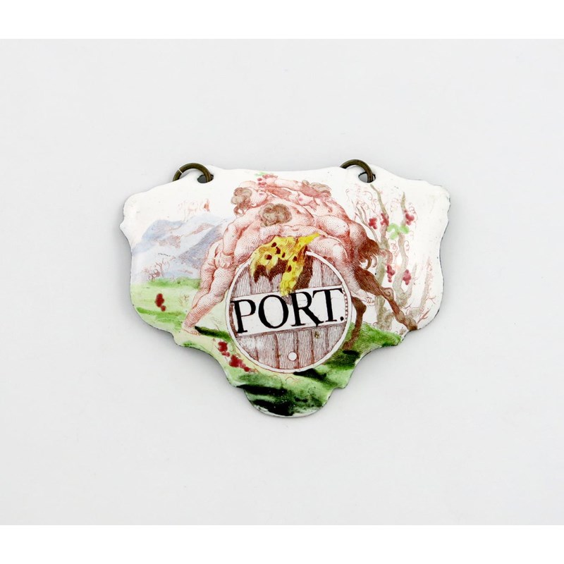 The Battersea factory at York House was founded in 1753 by the partnership of Janssen, Delamain and Brooks, aiming to make use of a process to transfer engraved designs onto enamel. Wine labels were amongst the range of luxury goods produced before the closure of the factory in 1755 or 1756. Amongst the lots at Jannsen's bankruptcy sale in 1756 were 'Bottle tickets with Chains for all sorts of Liquor, and of different subjects...'. There appears to be seventeen different designs and around forty different recorded titles.
