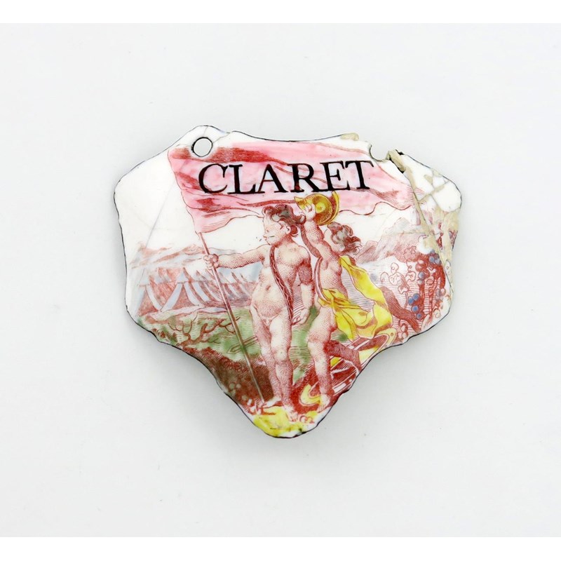 escutcheon form, with two cupids in front of rows of tents, holding a banner, titled 'CLARET', some damage, length 6.6cm.