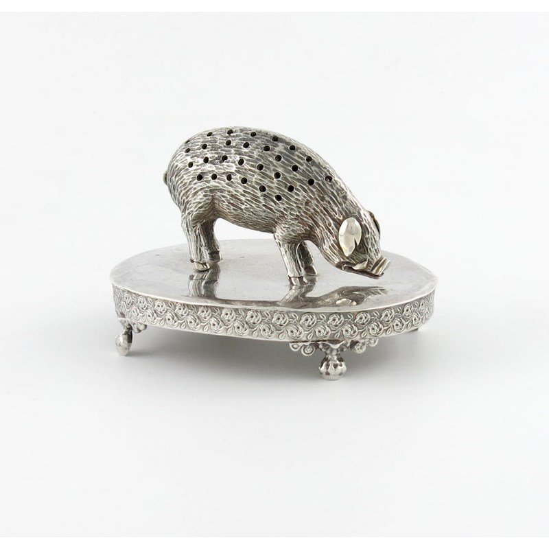 oval form, mounted with a pig, the back pierced, foliate border, on four paw feet, length 10.2cm, approx. weight 4.9oz.