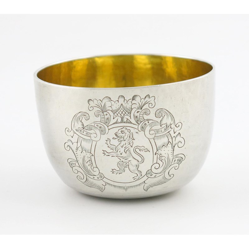 plain circular form, gilded bowl, engraved with a crest within foliate scroll mantling, diameter 7cm, height 4.8cm, approx. weight 2.8oz.