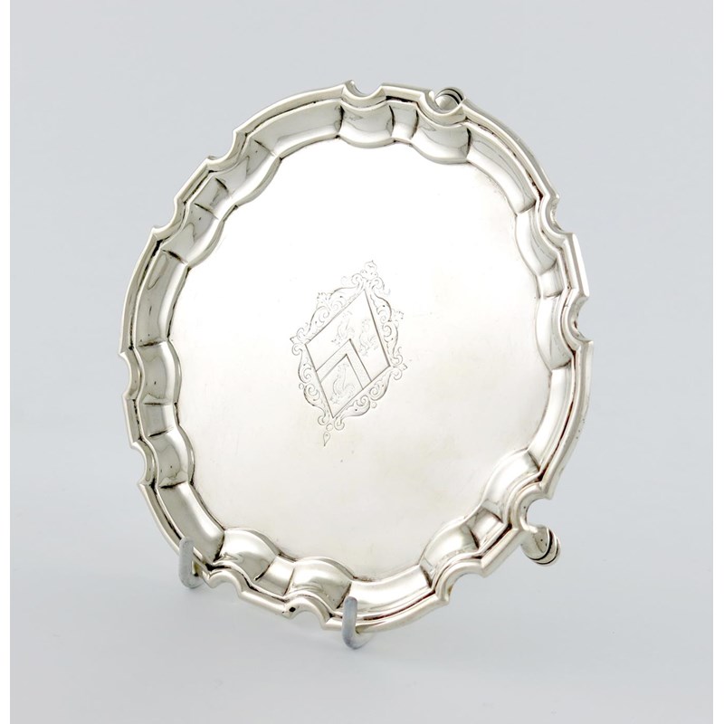 circular form, moulded border, the centre with a widow's lozenge within foliate mantling, on three hoof feet, diameter 14.8cm, approx. weight 7.5oz.