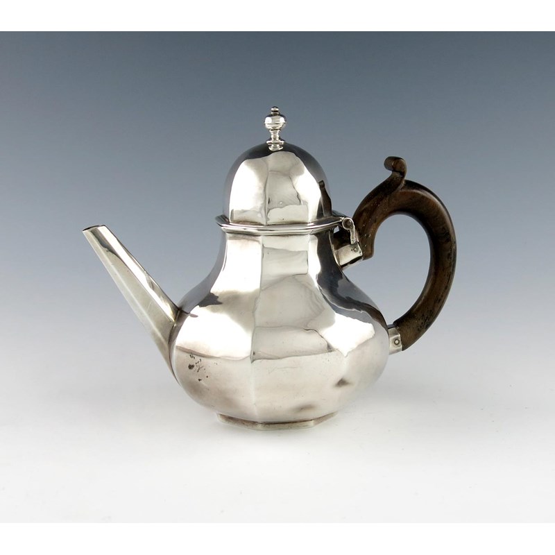 octagonal baluster form, scroll handle, octagonal domed cover with a knop finial, tapering faceted spout, length handle to spout 20cm, approx. weight 12oz.
