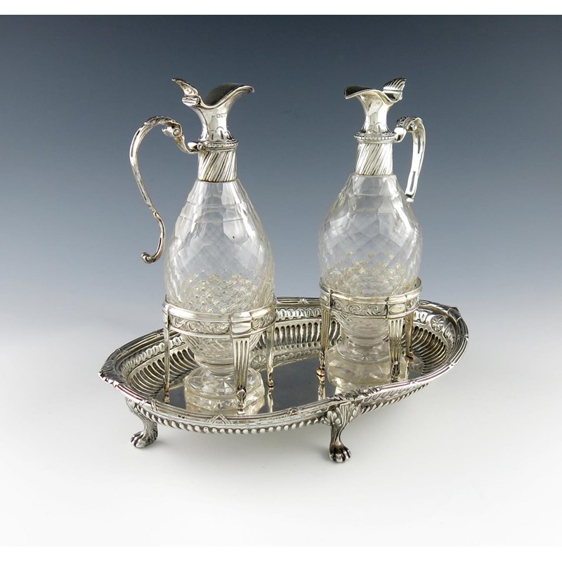oval form, part-fluted decoration, ribbon and reed borders, wire-work frames, on four paw feet, with two silver-mounted glass oil and vinegar bottles, one by Sebastian Garrard, the other by Charles Stuart Harris, length 30.2cm, approx. weight 31.8oz.