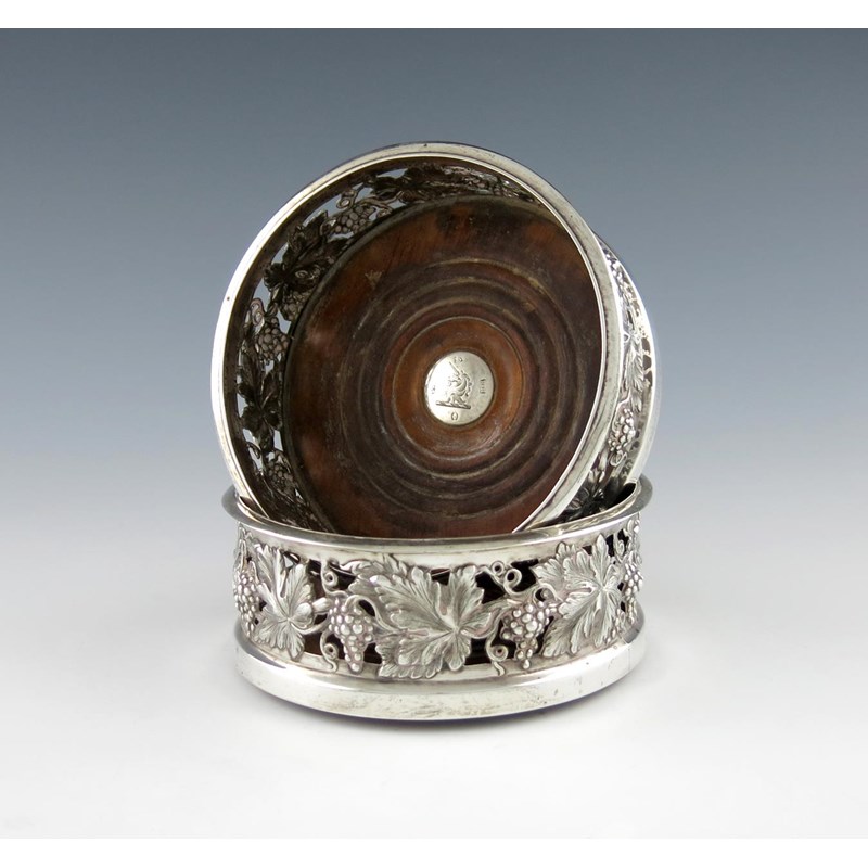 circular form, pierced and embossed trailing vine and grape decoration, turned wooden bases with crested silver buttons, diameter 14.3cm. (2)