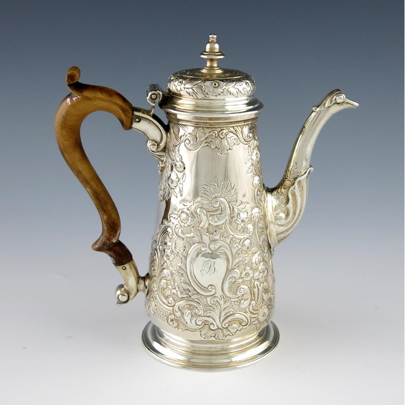 tapering circular form, later chased foliate scroll decoration, scroll handle domed cover with a knop finial, with two cartouches, one initialled, height 20.5cm, approx. weight 19.9oz.