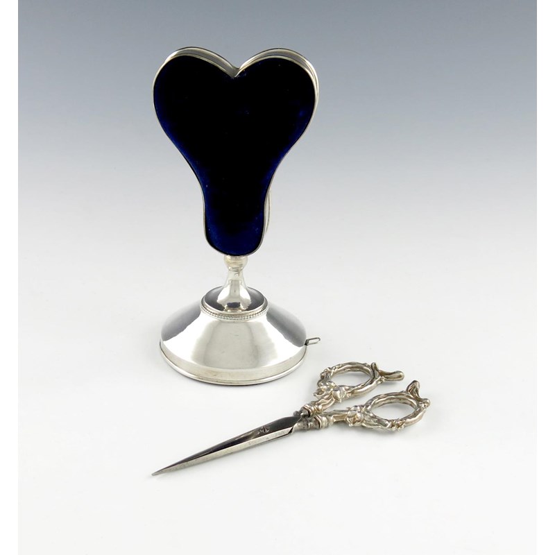 An Edwardian silver pin cushion, scissor stand and tape measure,