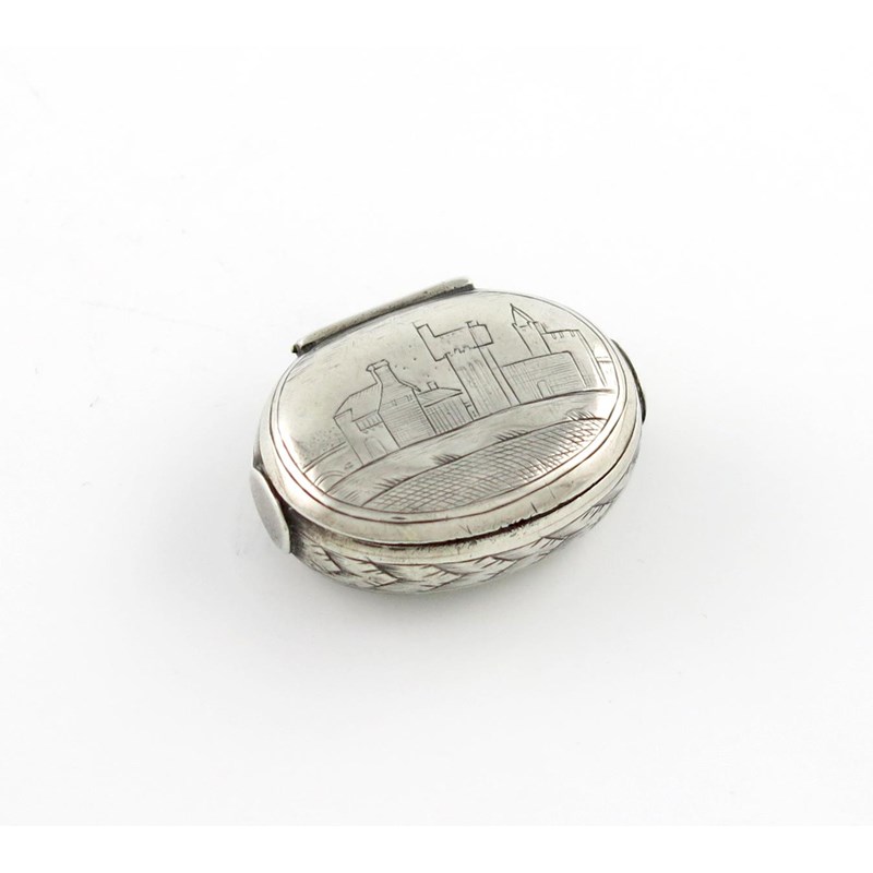 oval form, the hinged cover engraved with buildings, the sides with chevron decoration, and base with engraved foliate scroll decoration, length 4cm, approx. weight 0.5oz.