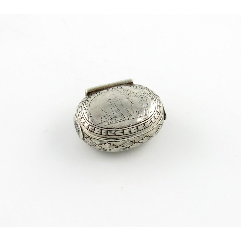 oval form, the hinged cover engraved with a cupid, with a building behind, and engraved 'MOVVOIR FAIT VNIR', the sides with chevron decoration, and base with engraved foliate scroll decoration, length 3cm, approx. weight 0.2oz.