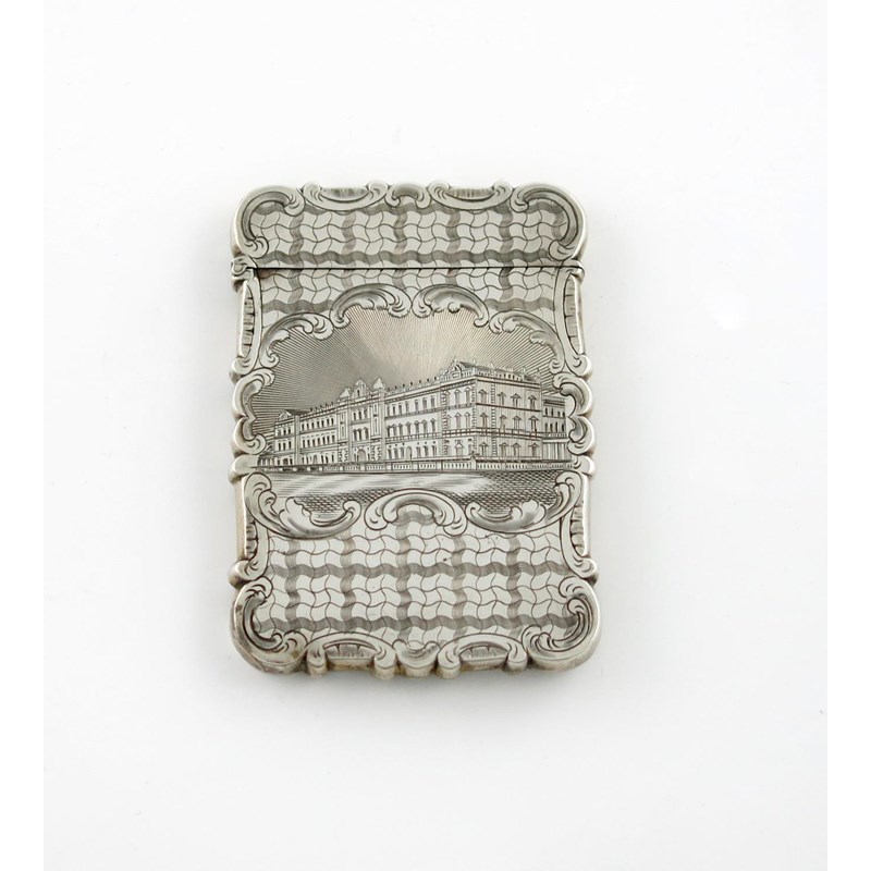 A Victorian silver engraved 'castle-top' card case, Buckingham Palace,