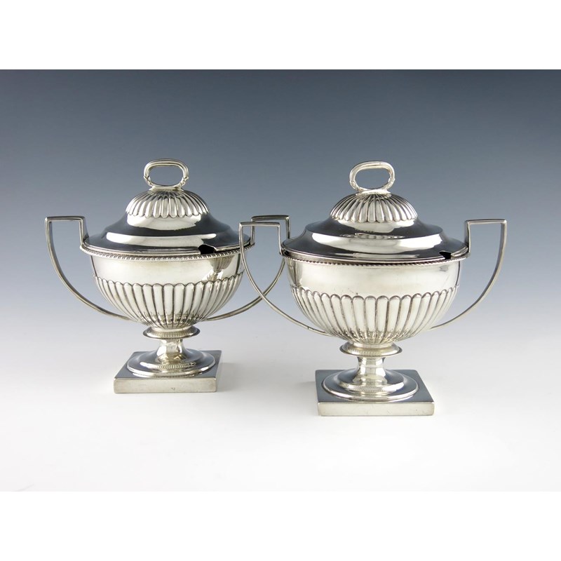 circular form, scroll handles, part-fluted decoration, the domed covers with part-fluted decoration and reeded loop handles, on raised square bases, length handle to handle 18.6cm, approx. weight 32.2oz. (2)