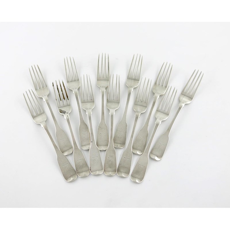A set of twelve George III Irish silver Fiddle pattern dessert forks