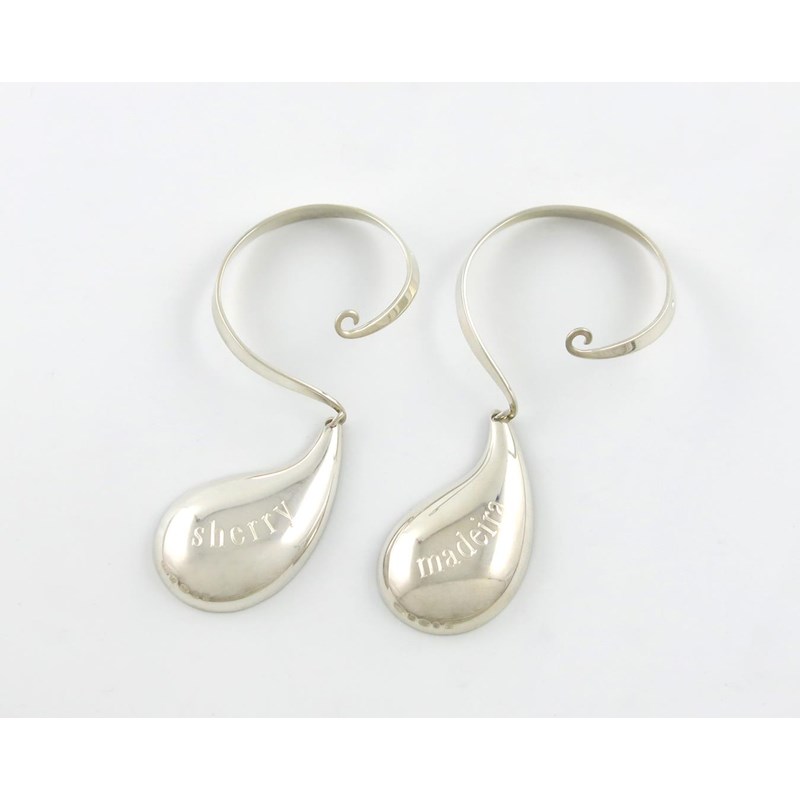 tear drop form, scroll ring handle, engraved 'SHERRY' and 'MADEIRA', length 11cm, approx. weight 1.4oz. (2)