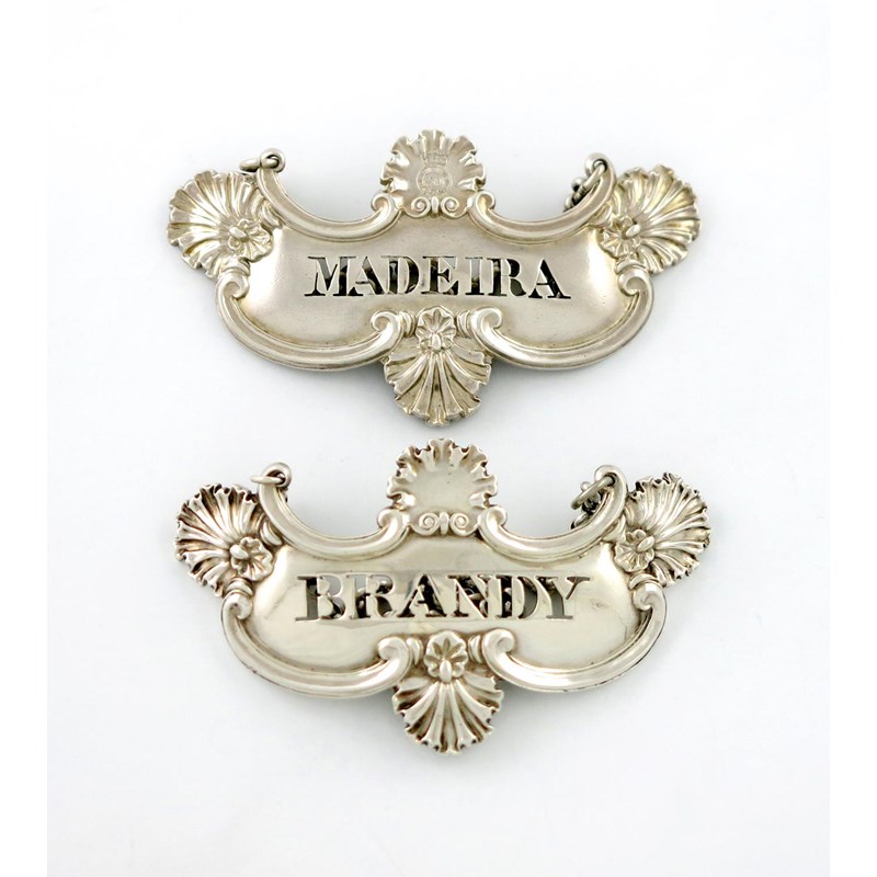shaped scroll form, with shell mounts and engraved with the badge of the 50th Regiment, pierced 'MADEIRA', length 8.5cm, plus a similar wine label, re-titled 'BRANDY', marks possibly lost in re-titling, approx. weight 2.3oz. (2)