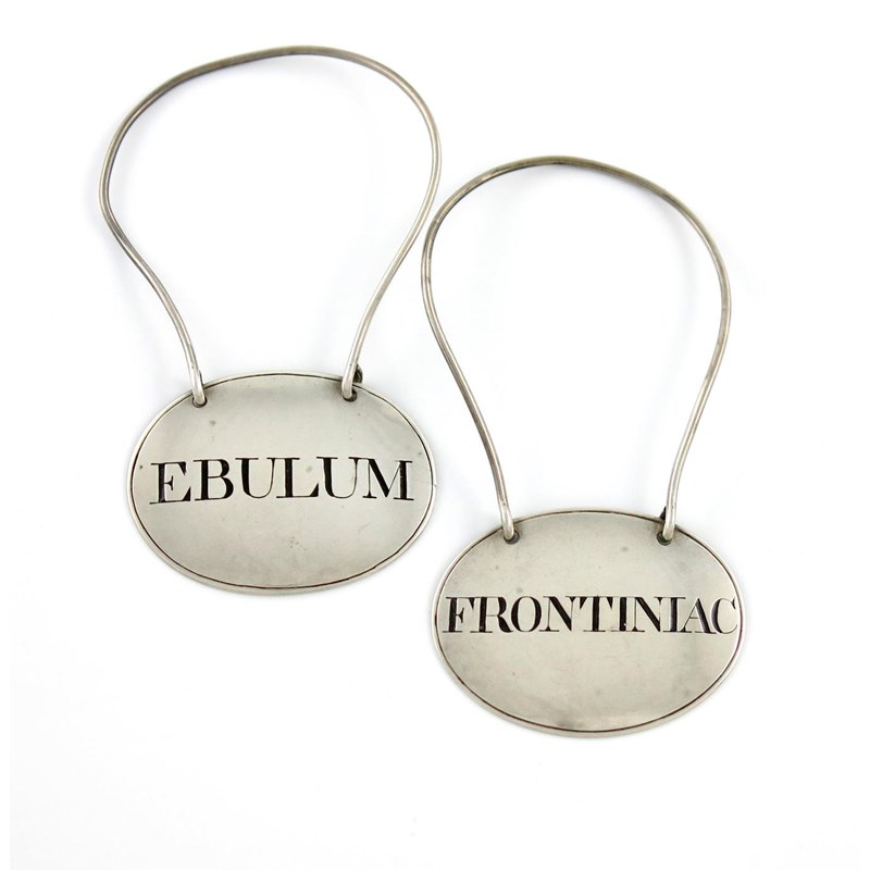 oblong form, wire-work neck rings, incised and blackened 'EBULUM' and 'FRONTINIAC', length 5.3cm, approx. weight 1oz. (2)