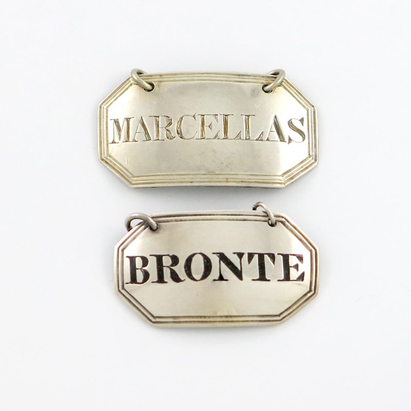 rectangular form, canted corners, reeded borders, incised and blackened 'BRONTE', plus a William IV silver label, by Reily and Storer, London 1830, incised 'MARCELLAS', approx. weight 0.6oz. (2)