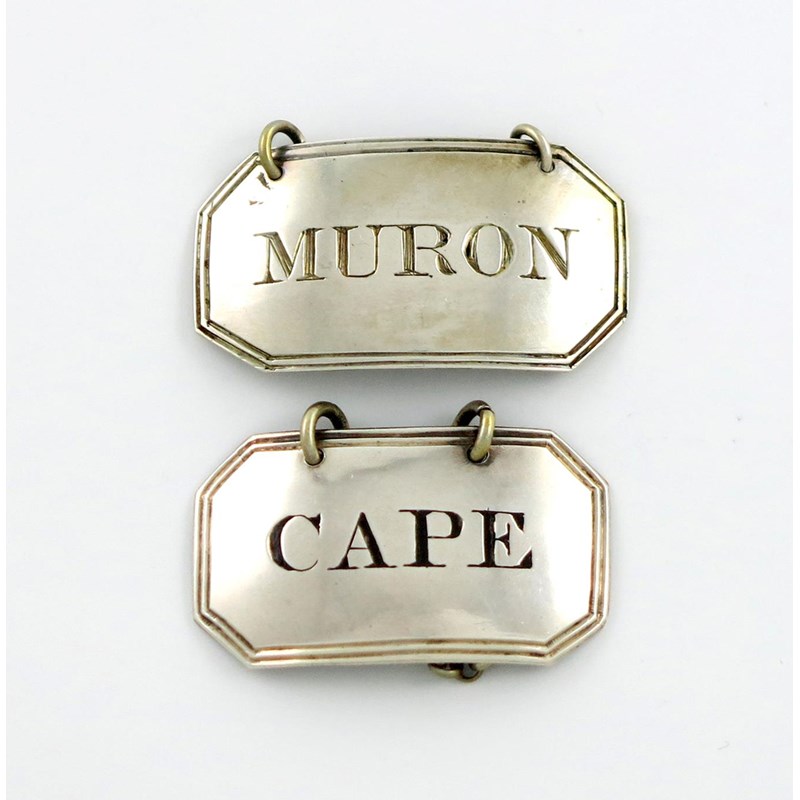 rectangular form, canted corners, reeded borders, incised and blackened 'CAPE', plus a George III silver wine label, unmarked, similar form, incised 'MURON', approx. weight 0.5oz. (2)