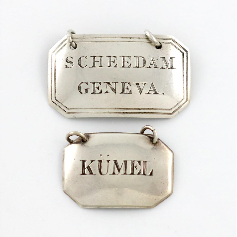 rectangular form, canted corners, reeded borders, incised 'SCHEEDAM GENEVA', plus a Victorian silver wine label, H. Thornhill, similar form, incised 'KUMEL', approx. weight 0.5oz. (2)
