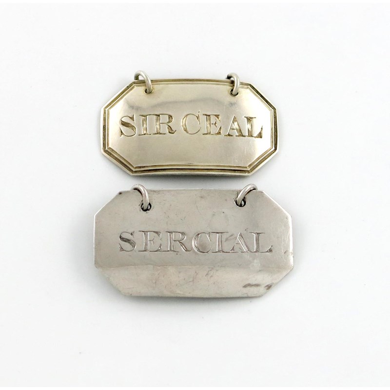 rectangular form, canted corners, incised 'SERCIAL', plus a George IV silver wine label, by Charles Rawlings, London 1821, similar form, reeded borders, incised 'SIRCEAL', approx. weight 0.6oz. (2)