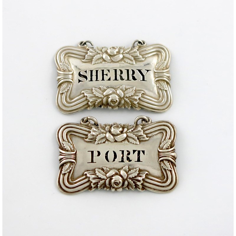 shaped rectangular form, fluted and foliate border, pierced 'SHERRY' and 'PORT', length 6cm, approx. weight 1.2oz. (2)