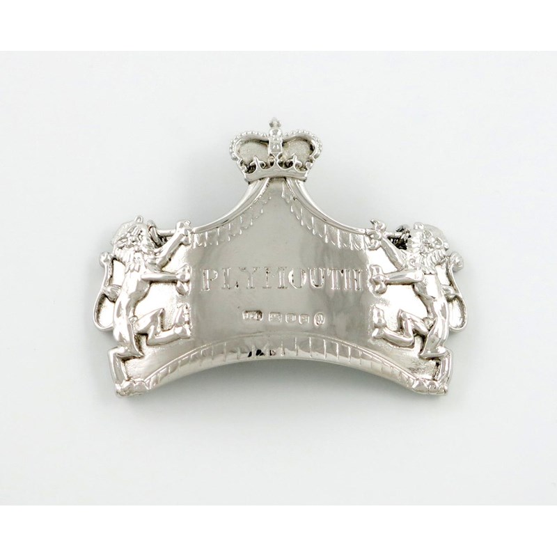 shaped form, with a crown finial, and mounted with two standing lions, incised 'PLYMOUTH', rhodium plated, length 6.2cm, approx. weight 0.9oz. (2)