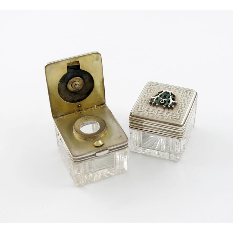 A Victorian silver-mounted glass travelling inkwell and vesta box