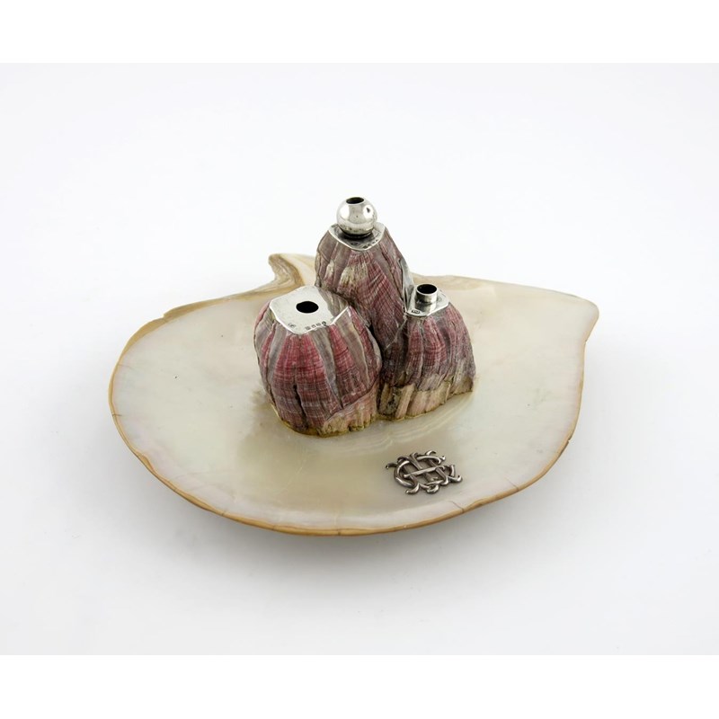 the three central shells with plain mounts, on a shell base, applied with a monogram, on an oval plated base, length 21cm.