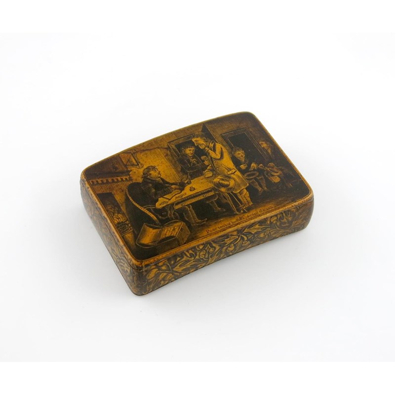 A 19th century Mauchline Ware sycamore and pen work snuff box