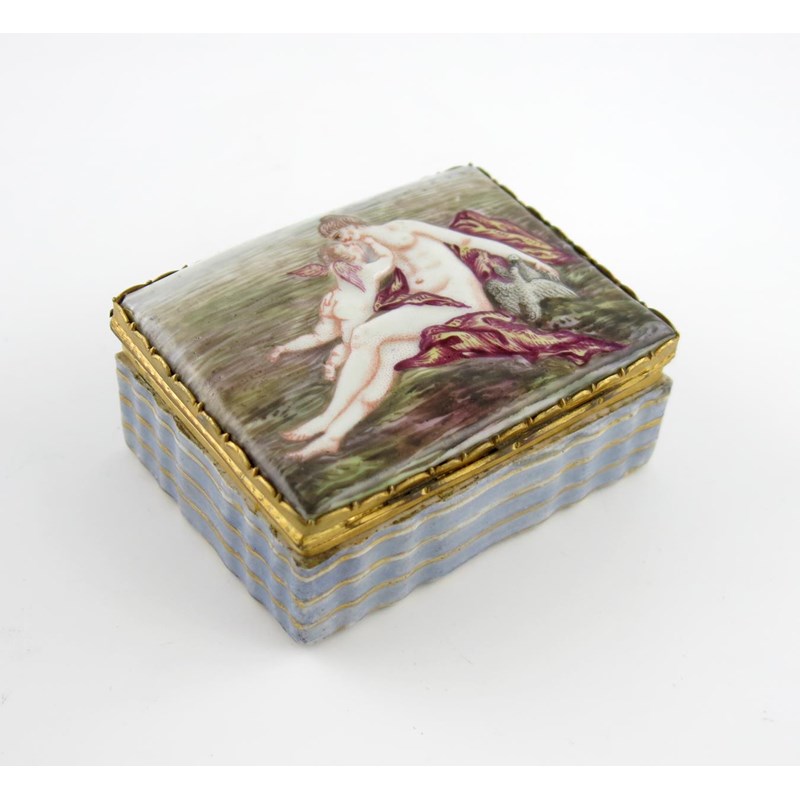 probably 19th century, the cover with raised decoration of Cupid embracing Psyche, whose left hand reaches out to a pair of doves beside her, the sides and base with wave and shell moulding, decorated in a pale lilac with narrow gilt bands, with gilt metal mounts, 8.2cm across.