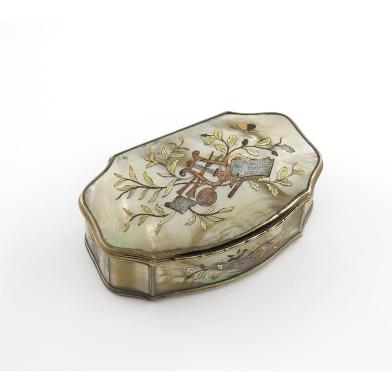 A mid 18th century continental silver-gilt, mother-of-pearl, and vari-coloured gold inlaid table snuff box,