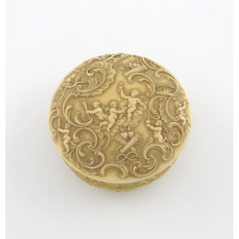 circular form, the cover carved in relief with six frolicking putti among clouds, torches and flaming hearts between foliate scrolls, the base carved in relief with cupid looking down from a cloud over two putti and two birds, diameter 7.5cm.
