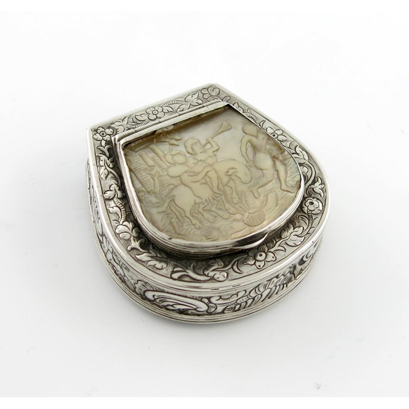 horseshoe form, chased and embossed foliate scroll borders, the hinged cover with a figural scene, the base engraved, length 7.5cm.