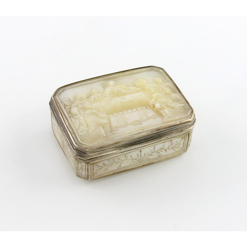 rectangular form, canted corners, reeded mounts, the hinged cover with a raised relief of the Last Supper, the sides with engraved decoration, decorated base, length 7cm.