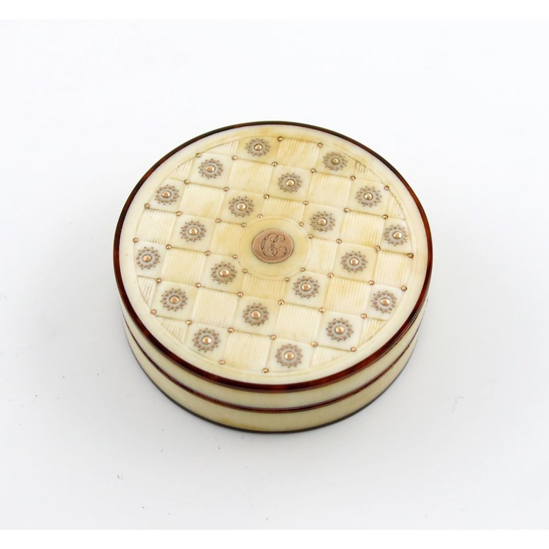 circular form, the pull-off cover with carved basket-weave squares with alternate panels with stud decoration, the centre with a circular initialled cartouche, tortoiseshell lining and stringing, diameter 6cm.