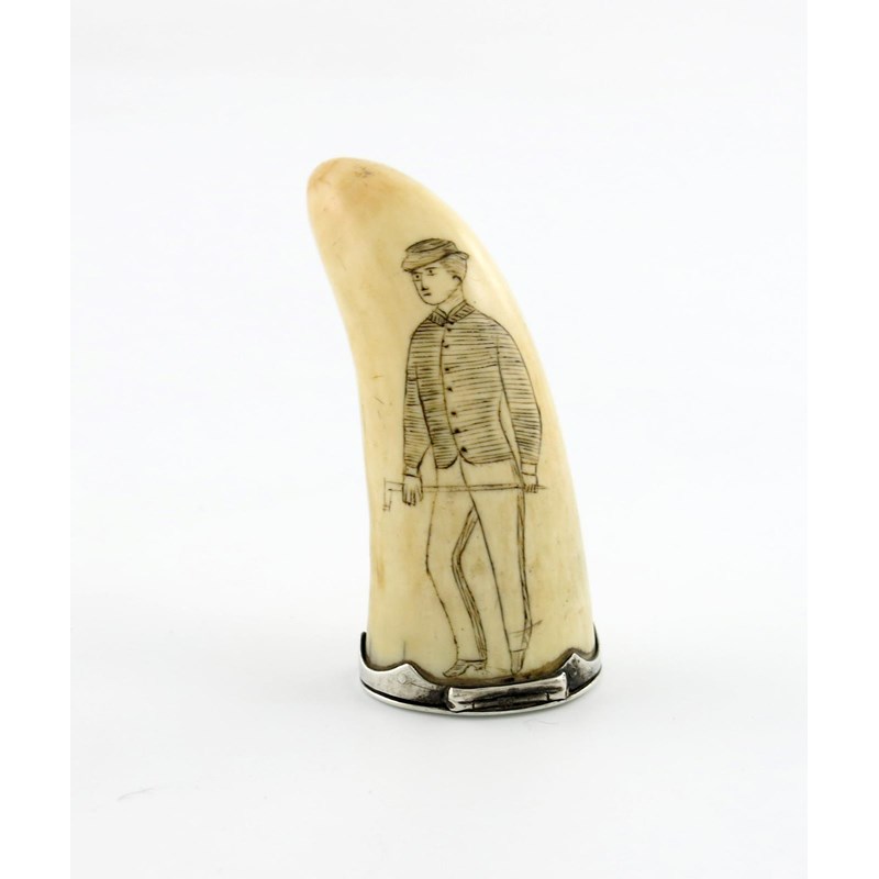 λA 19th century silver-mounted scrimshaw snuff mull