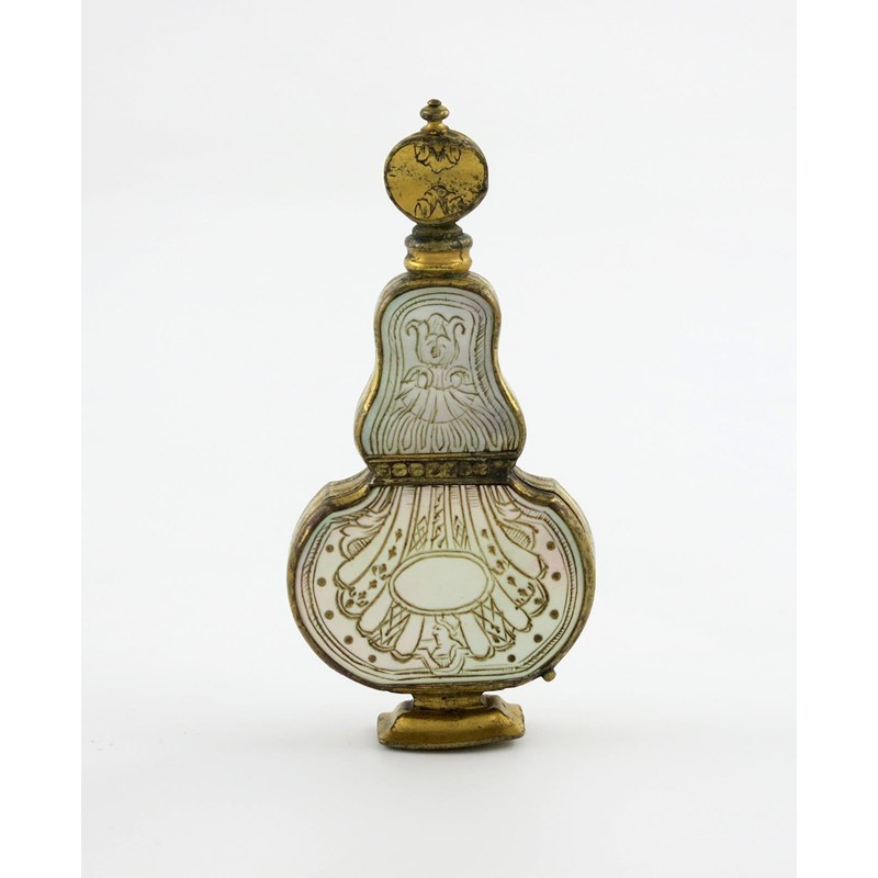 A mid 18th century gilt metal mounted mother-of-pearl snuff box / flask unmarked
