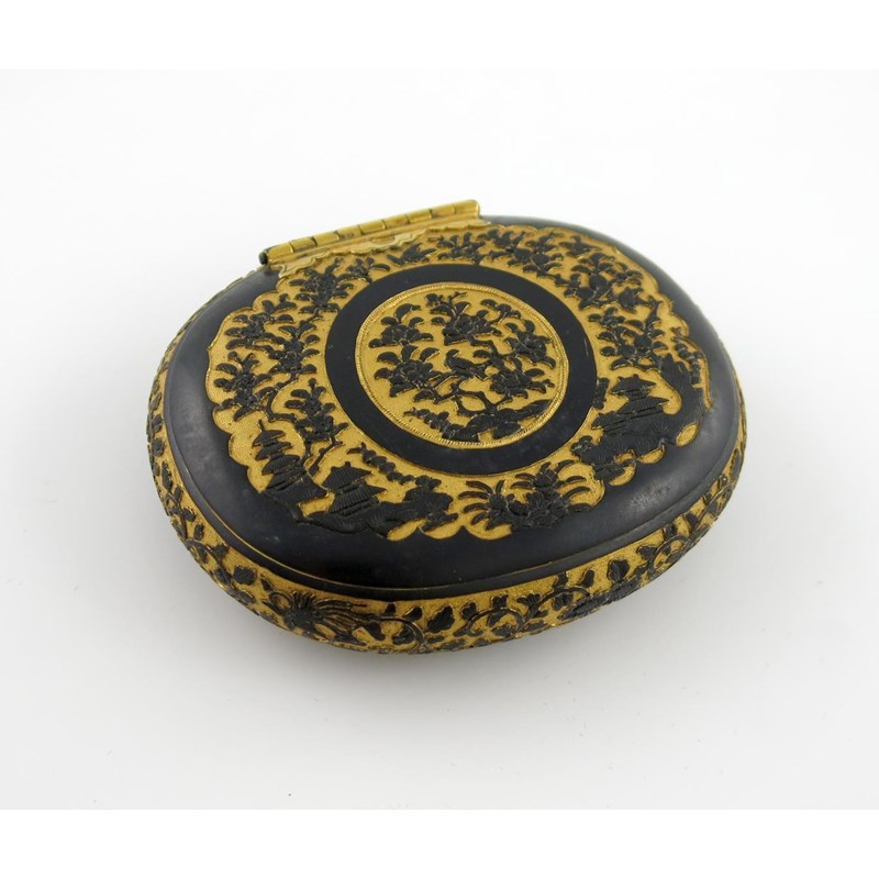 oval form, the flush cover with typical bas relief decoration of a central prunus tree with a bird on a branch within a black lacquered roundel with a prunus tree to either side and black border, the sides with a flowering vine with birds, the base with central cloud tree with birds in a roundel, within a border of flowers, gilt interior, length 9cm.