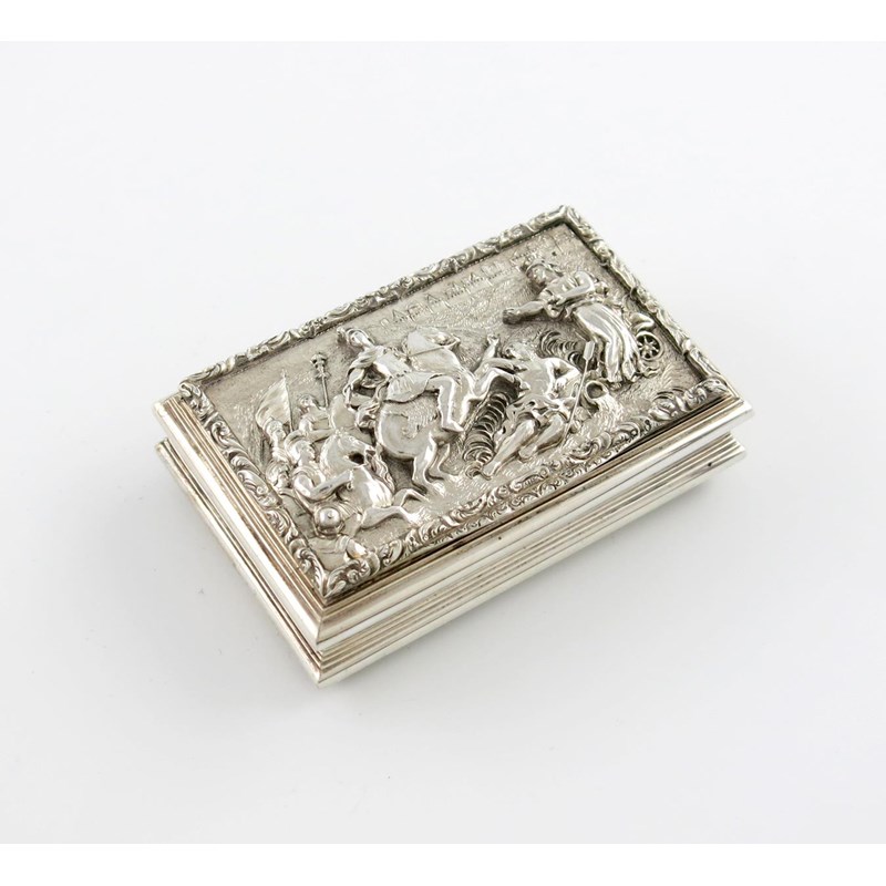 rectangular form, the hinged cover with a raised classical battle scene, possibly Alexander The Great on horseback at the Battle of Issus, reeded sides and engine-turned base with a vacant cartouche, length 7.7cm, approx. weight 4oz.