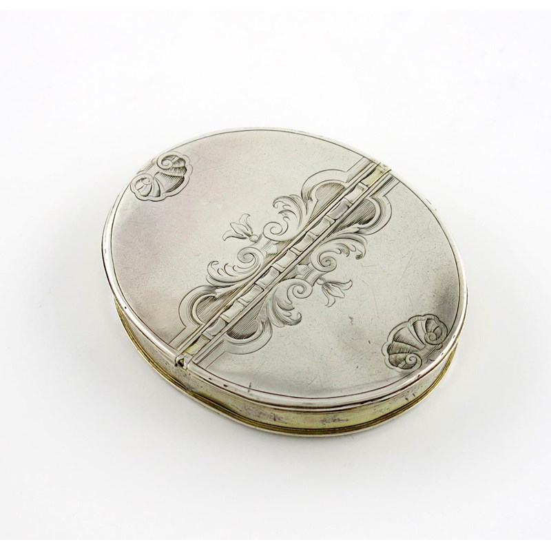 oval form, with two flush hinged covers with engraved scroll and shell decoration, gilded interior, the sides with traces of gilding, length 7.5cm, approx. weight 2.6oz.,