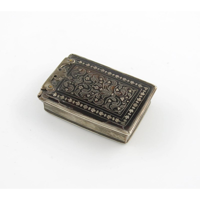 rectangular form, the hinged cover with foliate scroll decoration, foliate border, plain sides, tortoiseshell base, length 6.6cm.